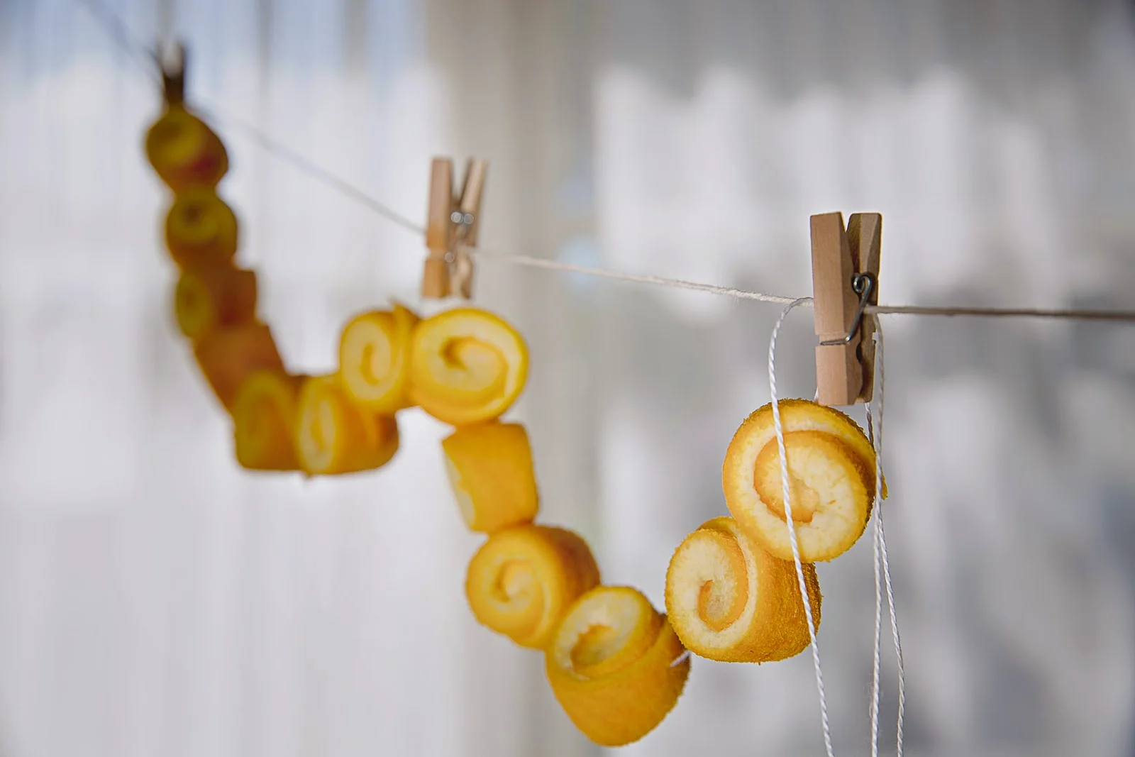 Divide and peel the orange in 4 main peels. Gently peel and then half them. You should have about 8 ribbons of peels. Starting from the thicker part of the peel, roll them in a shape of snail and thread them as a necklace on a cotton thread. This is important to give the peels the shape and to get them set in spirals. If needed, roll the thread around each bead to keep them snug.